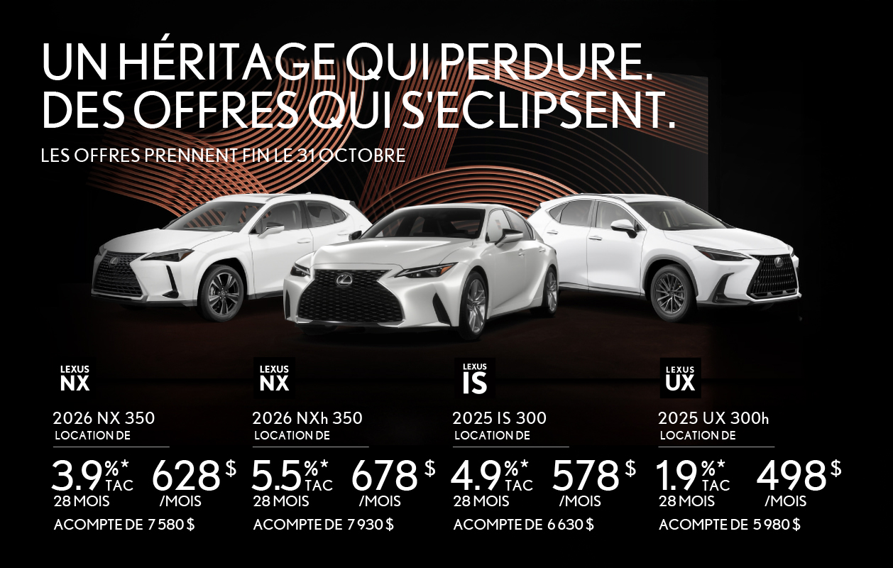 Offre de location d’une durée limitée offerte par l’entremise de Lexus Services Financiers, sur approbation du crédit. Exemple de location pour un modèle 2026 Lexus NX 350 AWD Premium Package (sfx « P ») neuf et non enregistré auparavant. Le prix du véhicule est de 58 864 $. Taux de location de 3,9 % pour 28 mois. Le paiement mensuel est de 628 $ et comprend : les frais du concessionnaire allant jusqu’à 999 $; les frais de transport et de livraison de 2 205 $; les frais de climatisation de 100 $; jusqu’à 36,08 $ en droits réglementaires; jusqu’à 44 $ en frais d’enregistrement de privilège, incluant les frais d’agent d’enregistrement de privilège; de même que tous les autres frais, prélèvements et droits applicables (lesquels peuvent varier en fonction de la région et du concessionnaire). L’immatriculation, les assurances, l’enregistrement et les taxes applicables sont en sus. L’acompte de 7 580 $ ou un véhicule d’échange d’une valeur équivalente, le dépôt de garantie de 0 $ et le premier paiement mensuel sont exigibles au début du contrat de location. Obligation totale de 25 162 $.