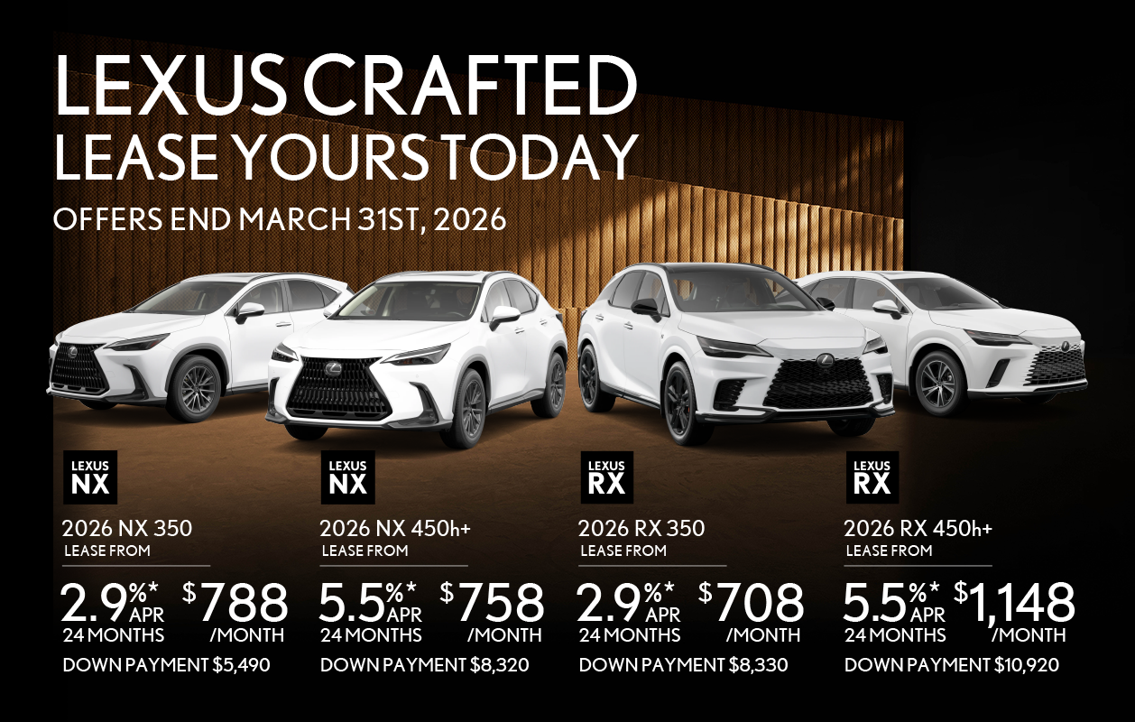 *Limited time lease offer available through Lexus Financial Services, on approved credit. Representative lease offer based on a new and previously unregistered 2026 Lexus NX 350 AWD Premium Package (sfx ‘P’). Lease Vehicle Price is $59,127. Lease APR is 2.9% for 24 months. Monthly lease payment is $788, which includes: Dealer fees up to $999; $2,205 Delivery and Destination charge; $100 A/C charge; regulatory fees (up to $48.22); lien registration fees (up to $44.00, including lien registering agent fee); as well as all other applicable fees, levies and duties (all of which may vary by region and dealer). License, insurance, registration, and applicable sales taxes are extra. $5,490 down payment or equivalent trade-in, $0 security deposit and first monthly payment due at lease inception. Total lease obligation is $24,405.